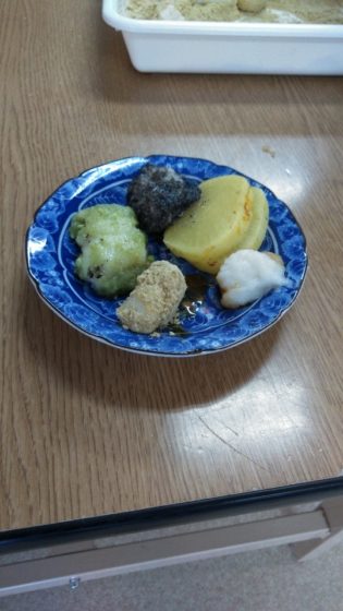 出来た餅を色々な味付けにして、バイキング形式で皆で食べました。