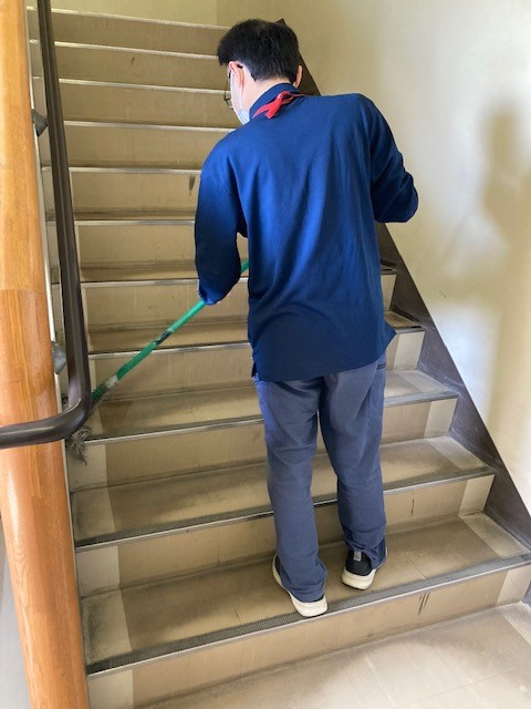 訪問した時は、階段のモップ掛け中でした。