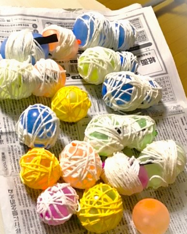 乾燥させて毛糸が固まったら水風船は割ったりして、