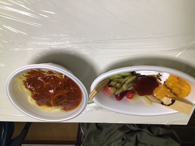 【出来上がったミートソーススパゲティ、プリンアラモード】