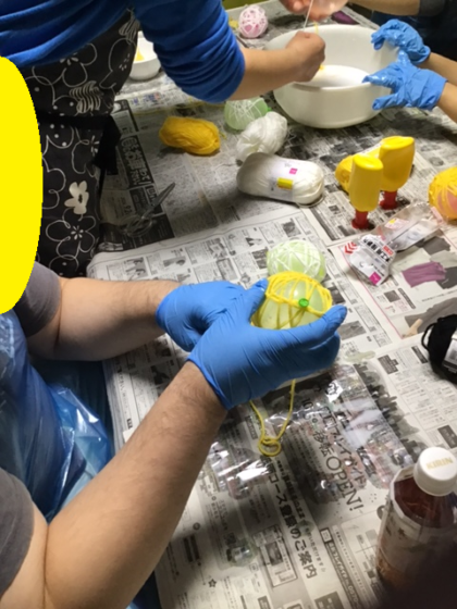 作ったものは、毛糸ボールと毛糸で作った蜘蛛、壁画などをチームに分けて作成しました。
